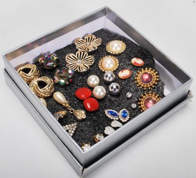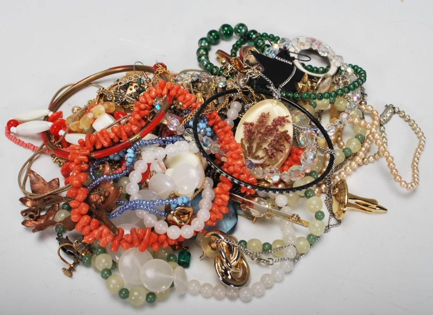 A collection of vintage and latter costume jewellery to include multiple pairs of earrings, rings, bangles, bracelets, necklaces, pendants etc. Varying styles with gold tone examples, glass, plastic etc. Together with a inlaid carved wood box and a mother of pearl purse.
