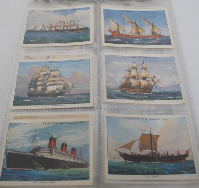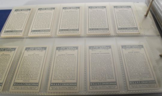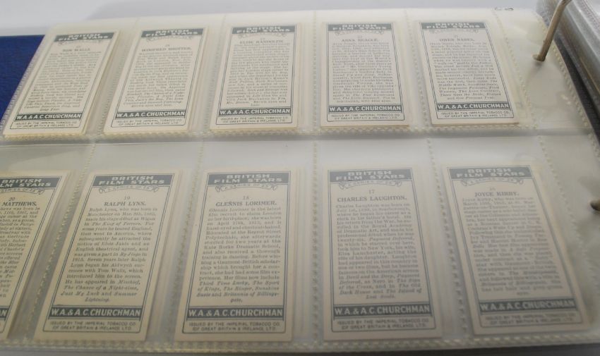 An album of vintage Churchman cigarette trade cards. Full sets include Cricketers, 3 Jovial Golfers in Search of the Perfect Course, Famous Railway Trains, British Film Stars, Warriors Of All Nations, Frisky, Eastern Proverbs Series One and Two, The Houses Of Parliament & Their Story, The King's Coronation (Large size), The Story Of Navigation (Large size), Howlers (Large size), Landmarks In Railway Progress, Italian Art Exhibition 1930, The Inns Of Court, Legends Of Britain, Well Known Ties and Curious Signs.