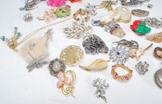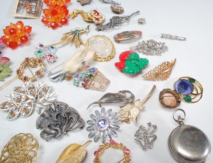 A collection of vintage mid 20th Century brooches to include a Scottish Grouse claw brooch, floral and figurative brooches, many set with coloured stones, clip on earrings, bracelets, a Stratton compact etc.