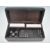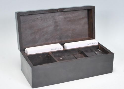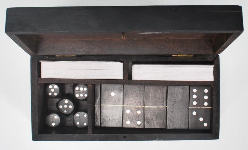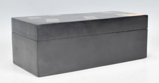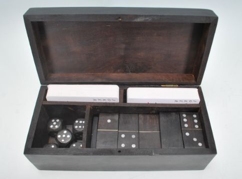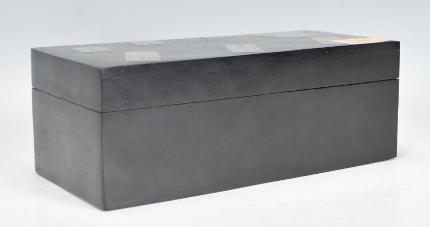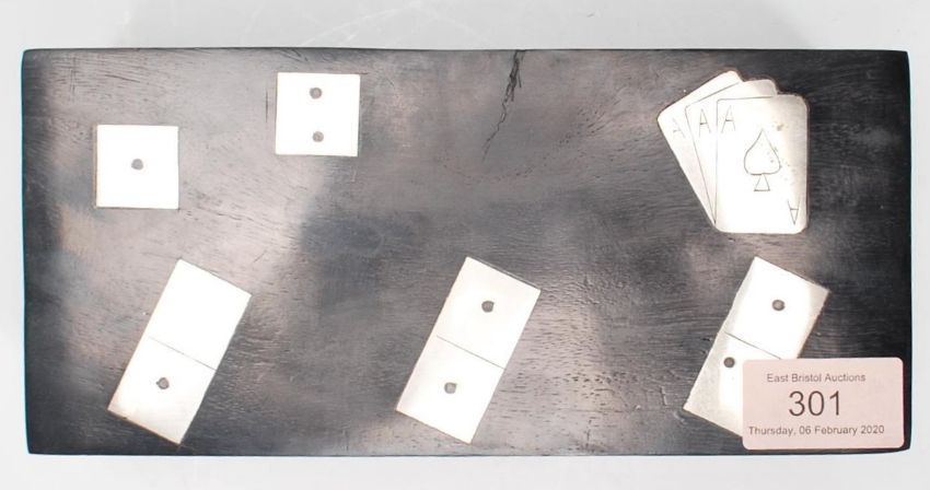 An early 20th Century ebonised mahogany games box of rectangular form inlaid with silver white metal domino pieces and playing cards atop. The hinged lid opens to reveal a fitted interior with two sets of playing cards, dice and dominoes. Box measures 7.5 cm tall by 21 cm wide by 10 cm deep.