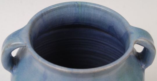 Upchurch - An early to mid 20th Century antique vintage Art Nouveau type studio art pottery twin handled baluster vase having tapered round body with waisted neck and flared rim with two handles either side finished in a blue glaze. Pottery marks to base. Measures; 25cm.