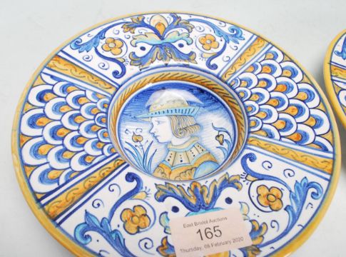 A pair of 20th Century majolica plates of round form having wide rims decorated with alternate panels of scalloped and foliate design, the plates each painted with cameos of a man and woman. Measures 20cm diameter .