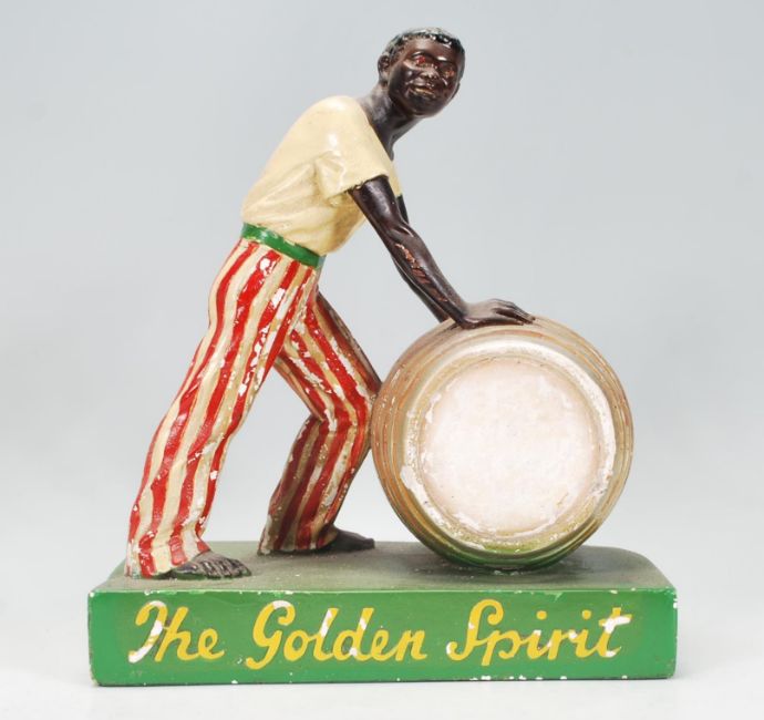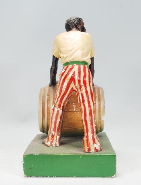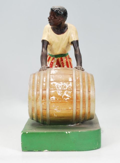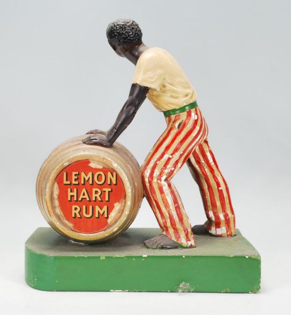 A vintage mid 20th Century Lemon Hart Rum advertising countertop figurine in the form of a figure pushing a barrel of rum raised on a plinth base hand painted throughout, the barrel reading 'Lemon Hart Rum', the base reading ' The Golden Spirit'. Measures 27 cm high.