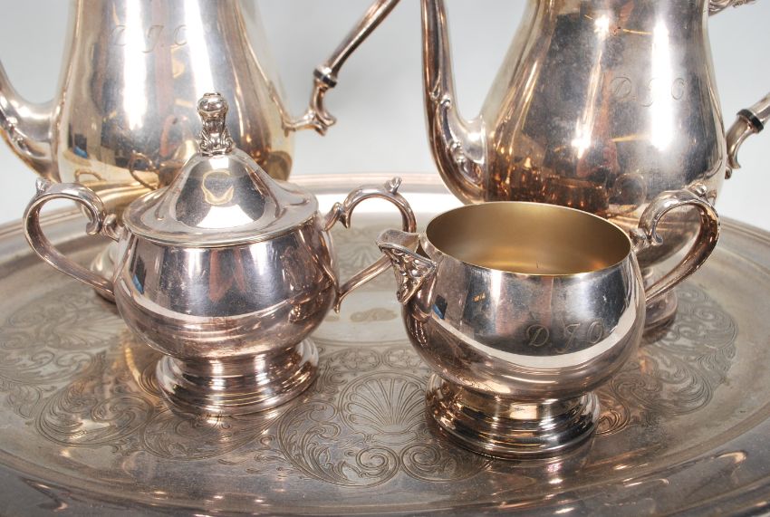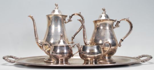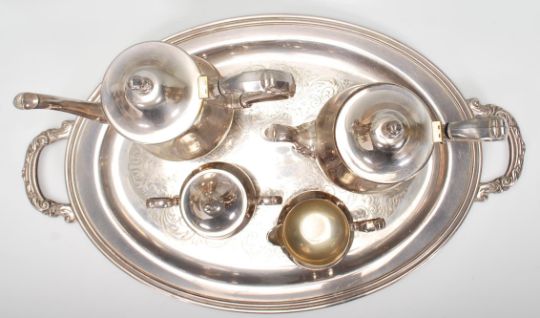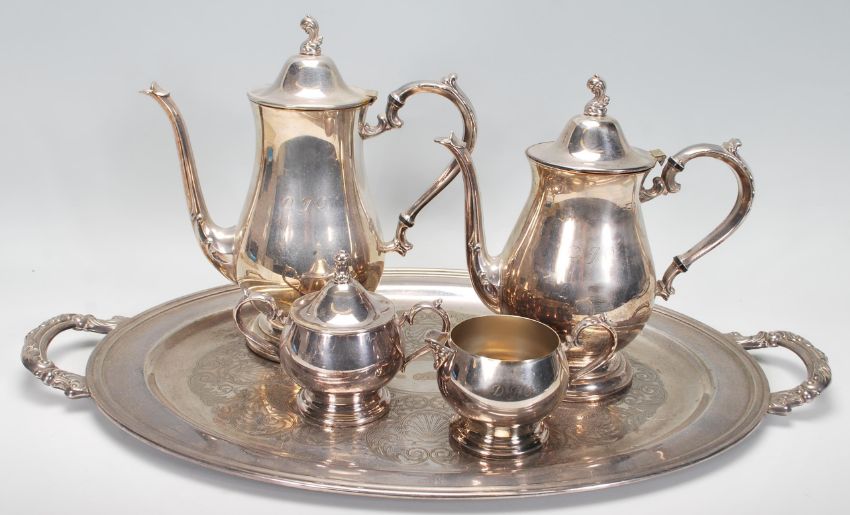A silver plated coffee and tea service by Oneida Silversmiths. The set of simple form having scroll foliate handles with all pieces inscribed D.J.O. The service consist of coffee pot, tea pot, twin handle sugar with cover, creamer / milk jug and tray having engraved shell and floral decoration. Marks to bases. Coffee pot measures 27 cm tall.