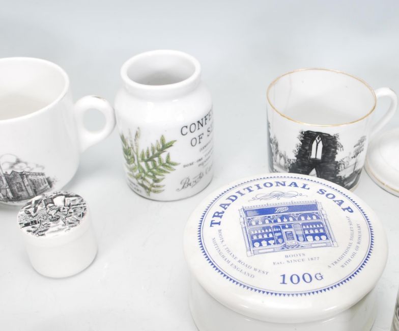 A selection of 19th Century and later ceramics to include a Dr Nelson's improved inhaler, a Bidmead economical polishing paste pot, confection of senna, Glycuma cream, a small cup hand painted with castle ruins, a Portsmouth harbour souvenir mug, a pair of souvenir candlesticks etc.