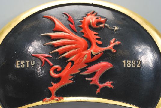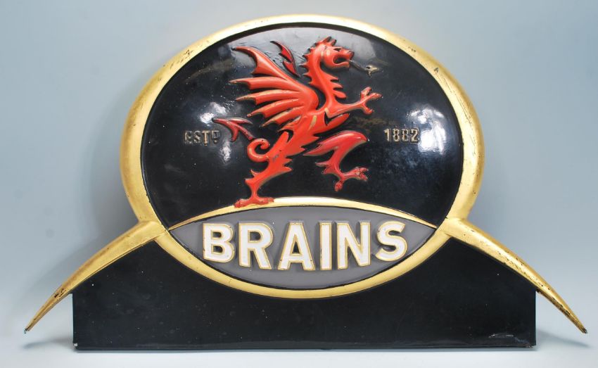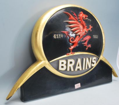 A large advertising point of sale brewery / pub sign for Brains Brewery having an ebonised ground with gilt border and red finished dragon.   Measures 44 cm x 74 cm.