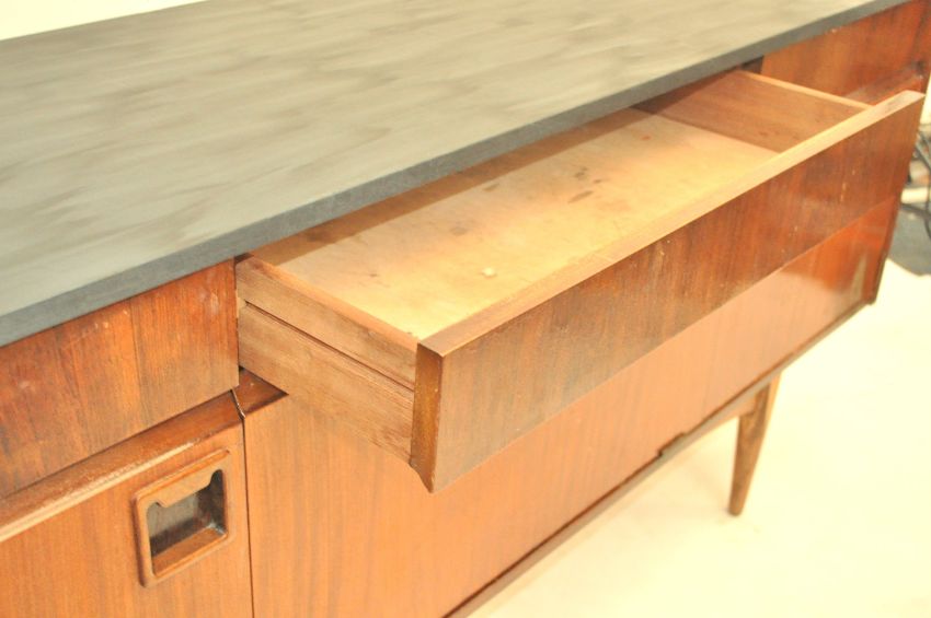 A 1960's EON Elliots Of Newbury  retro vintage teak wood sideboard credenza having three drawers above a central shelved cupboard flanked by another shelved cupboard and a drop down cocktail cabinet to the other side. Each door having a square recess and lipped handle. All raised on shaped tapering legs and fitted frieze.