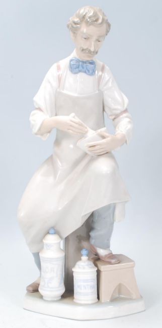 A Lladro porcelain figure of the 'Pharmacist' shown seated with a pestle and mortar. Marks to base for Lladro. Measures 32 cm tall.