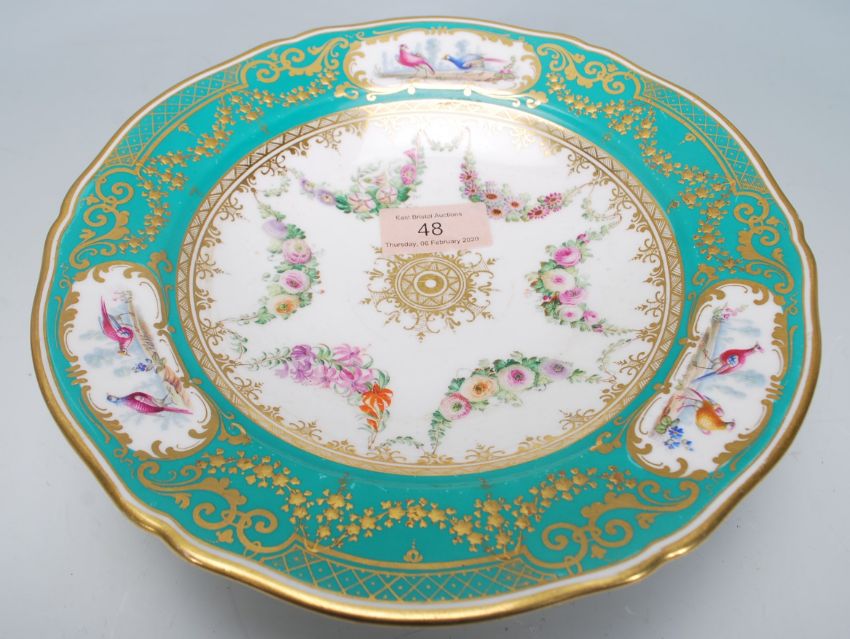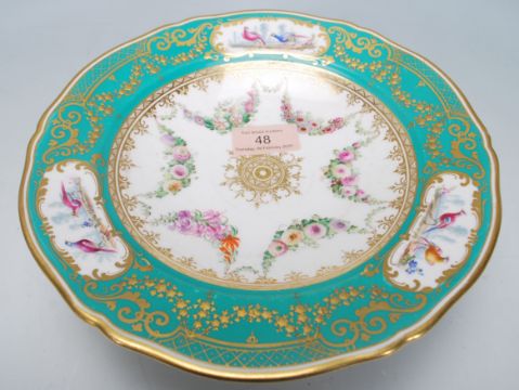 A 19th Century French style centrepiece tazza having a green ground with panels of hand painted pheasant decoration with floral garlands to the plate and gilt detailing throughout, raised on a round footed base. Marked a64 to the base.