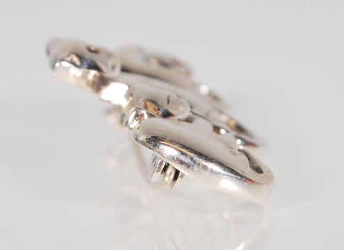 A sterling silver ladies brooch featuring three stylized cats with gemstone eyes. Measures: 4.2cm. Weight: 9.1g.