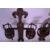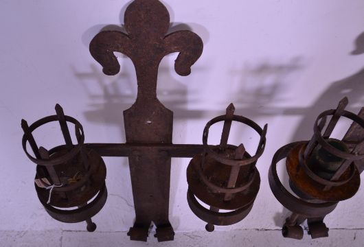 A pair of 19th Century cast iron medieval revival antique wall mounting torch folders, the wall brackets having fleur de lys shaped tops with split scrolled bottoms having two arms bearing round torch holders with pointed supports. Measures 80 cm high x 45 cm wide x 17 cm deep.