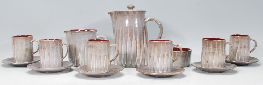 A vintage 20th Century Cornish studio art pottery coffee service to include six coffee cans having a grey glaze with a burgundy glaze to the inside to include coffee pot, milk jug, sugar bowl, coffee cans and saucers. Each signed FH to the bases.