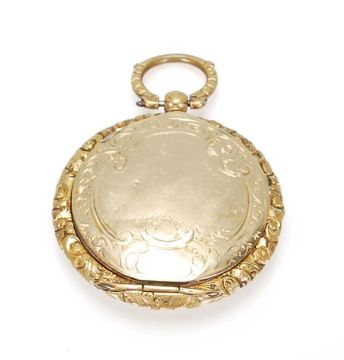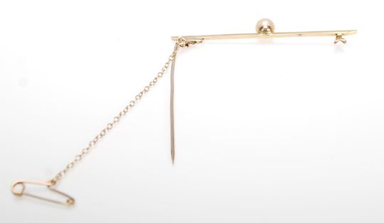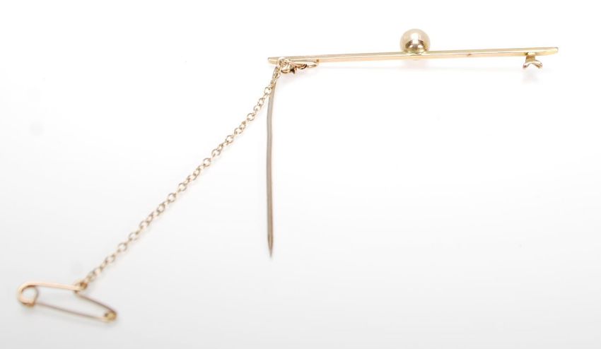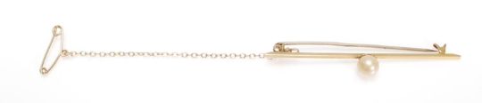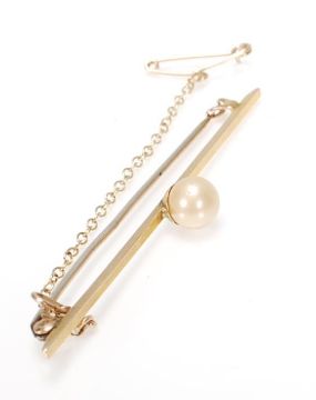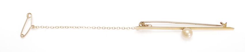 A 20th Century 9ct gold bar brooch of simple from set with a pearl to the centre, complete with safety chain together with a gold plated locket of round form with engraved scrolled decoration and fall front. Brooch weight approx 2.4g, unmarked but tests as 9ct gold.