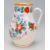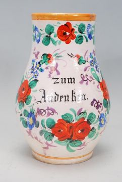 A 19th Century German lustre jug having a bulbous body raised on a footed base with a tapering neck and handle to the side, having hand painted decoration of florals, reading 'Zum Andenken'. Measures 21 cm high.