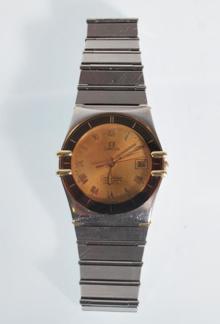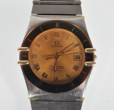 A gentleman's vintage Omega Constellation chronometer quartz watch. Having a round face with a gilt dial and roman numerals to the chapter ring and black enamelled bezel. Constellation badge embossed on back.