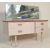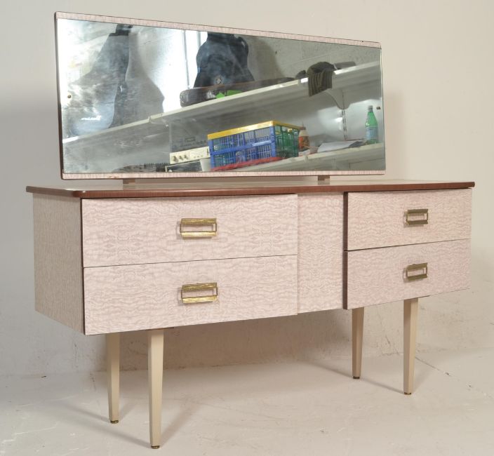 A vintage 20th Century melamine dressing table, central banks of drawers flanked by cupboards raised on tapering supports.  Measures 117cm high by 140cm wide by 45cm deep.