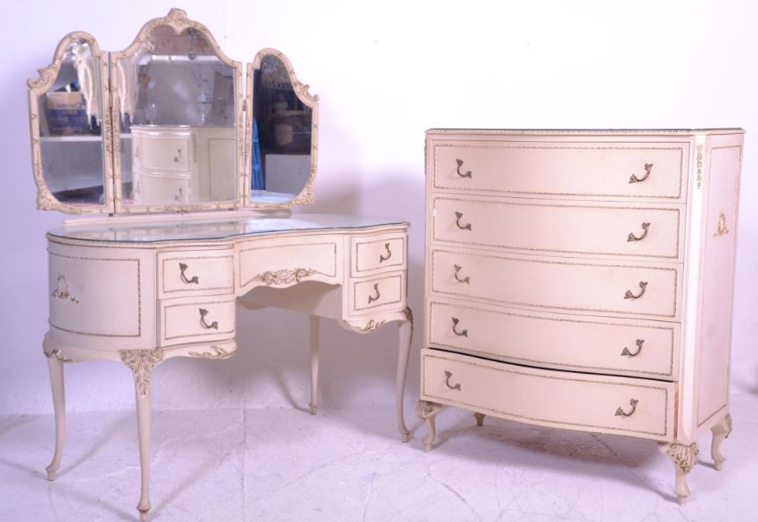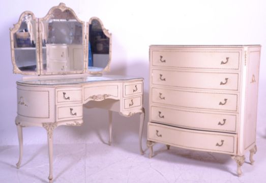 A 19th century Louis style suite comprising a serpentine fronted chest of drawers and a matching mirror back dressing table having a triptych mirror raised above a moulded shaped desk base with knee hole recess raised on cabriole legs. White painted with gilt detailing. Measures 110 cm high x 92 cm wide x 47 cm deep.