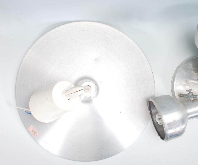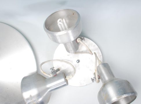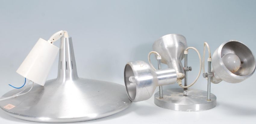 A good retro 20th Century ceiling light lamp fixture of UFO shape, finished in chrome with a plastic honeycomb diffuser. Together with a chrome ceiling three point spot light.
