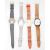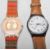 A group of three Swatch watches to include a silver tone bracelet watch, a brown leather strapped watch with a white enamelled dial and a watch with a gilt face having patterned strap, together with an early 20th Century silver watch with an enamelled face and arabic numeral chapter ring.