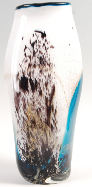 Mdina - Seascape - Large Tall Double Swirl Model 81-299 - A large contemporary Maltese studio art glass vase having a twisted form with ocean blue wave colours and black and azure gold ocean wave spray. Makers marks to base and sticker to front. Measures; 41cm.