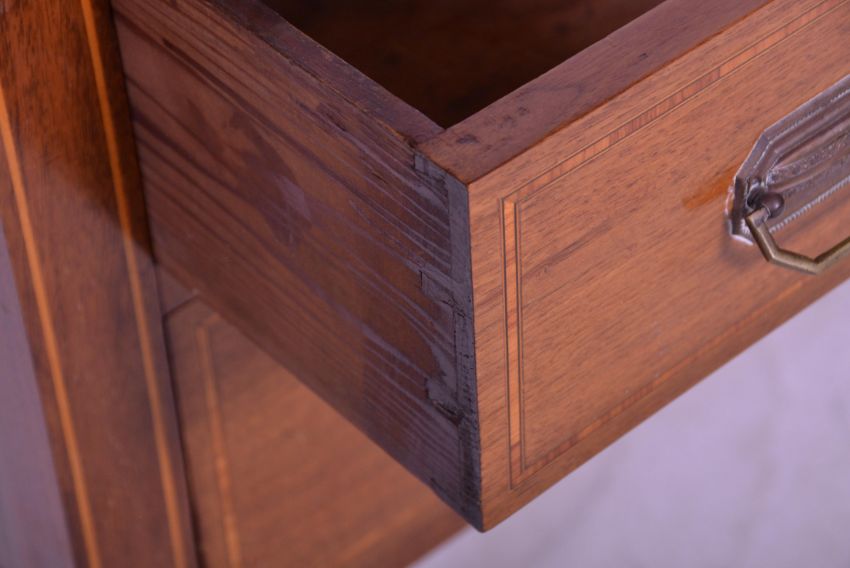An Edwardian mahogany and leather inlaid writing table desk. Raised on square tapering legs with fitted short and long drawers flanking central kneehole recess. Above, a tooled leather writing skiver top. Measures 78 cm high x 115 cm wide x 58 cm deep.