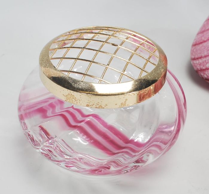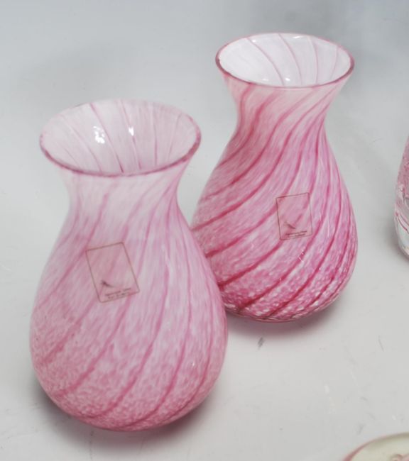 A good collection of 20th Century Caithness glassware, mostly pink in colour to include a matching pair of vases, rose bowl, Moon Crystal paperweight and other paperweights, scent bottle, bowls, vases etc. Most retaining original strikers or marked to base. Biggest measures 19 cm tall.