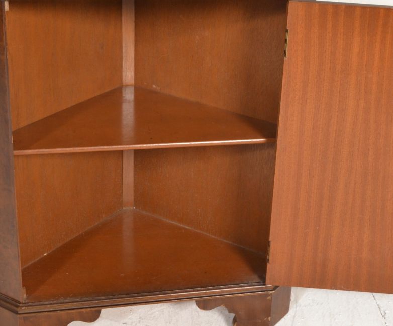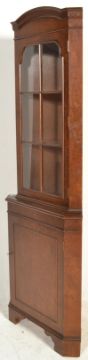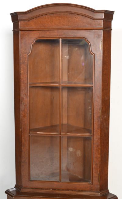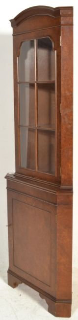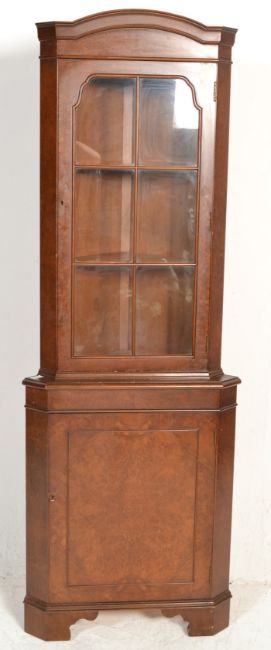 A Georgian revival good quality burr walnut corner cabinet being raised on block feet with single cupboard door beneath astragal glazed cabinet atop.