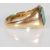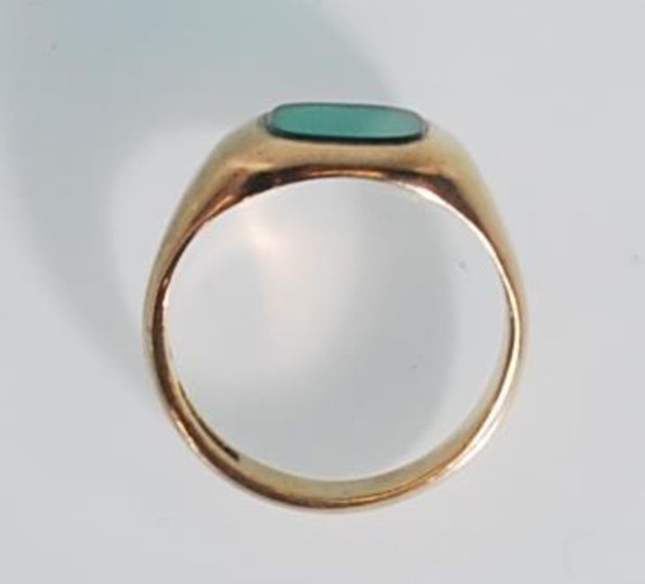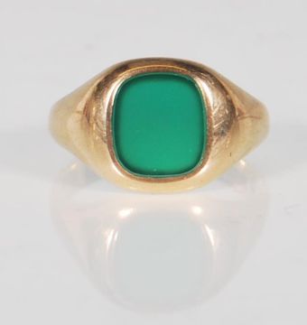 A hallmarked 9ct gold signet ring having a rectangular green stone panel to the head. Hallmarked Birmingham 1987. Weight 6.9g. Size U.5.