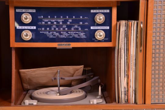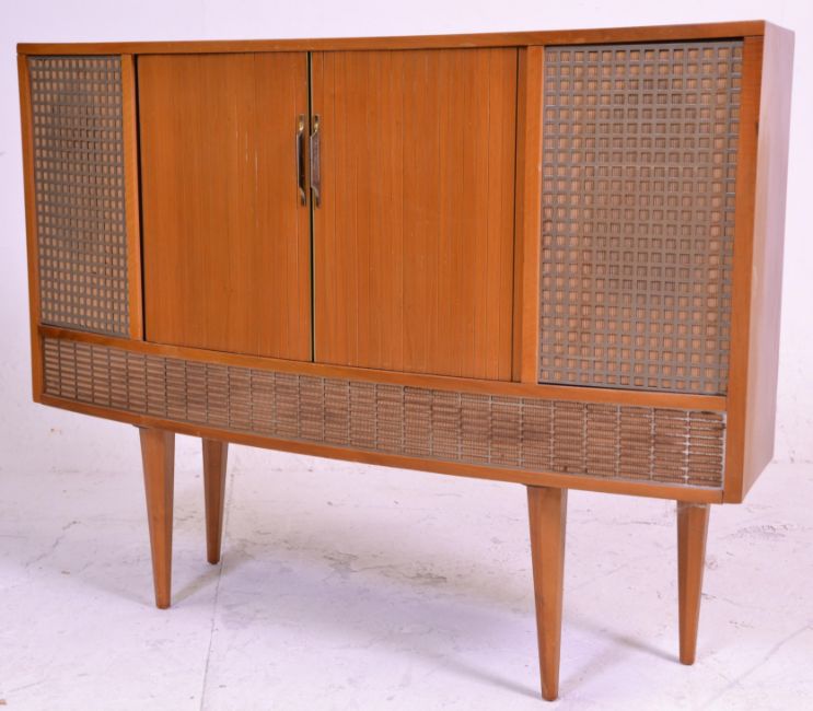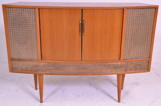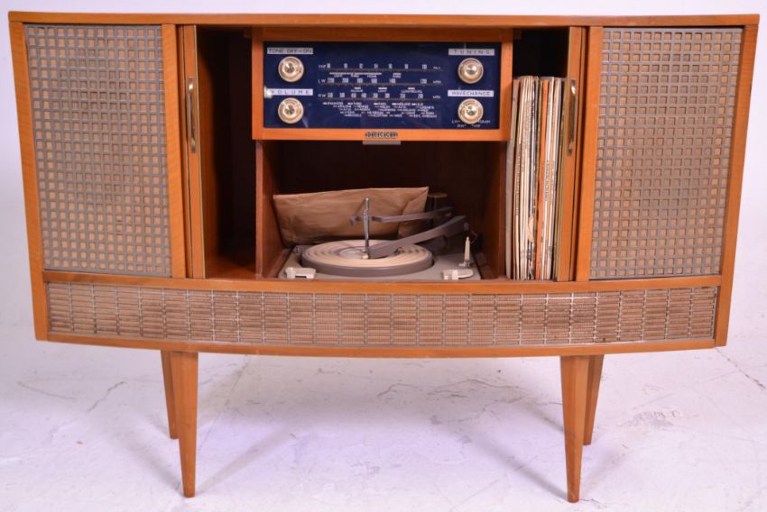 A vintage 1960's / 70's stereogram being beech wood cased, having a central Decca radio with record turntable below flanked by speakers to either side, complete with LP's within, raised on tapering turned legs. Measures 80 cm high x 110 cm wide x 37 cm deep.