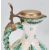 A 20th Century majolica jug of waisted form with a plaited design handle and pewter lid to the top, being hand painted with white ground and green geometric decoration. Measures 24cm tall.