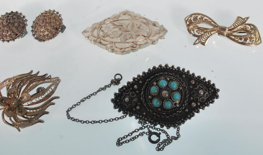 A selection of vintage 20th Century silver and silver white metal jewellery to include floral filigree brooches, a turquoise set brooch, a mourning brooch with engraved decoration etc. Some marked as silver. Weight approx 90g.