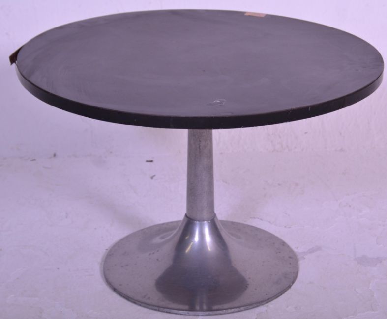 Arcana - A retro mid 20th Century Arcana made coffee / side table having a black finished round top raised on a chrome stem and circular base. Measures 40 cm high  x  60 cm diameter.