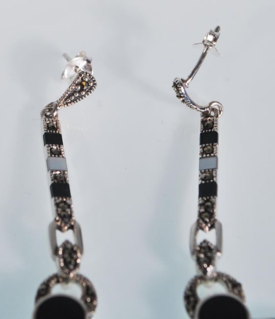 A pair of silver ladies drop earrings. In the style of Art Deco. Set with marcasites and mother of pearl. Stamped 925. Measures: 5.9cm. Weight: 12.7cm.