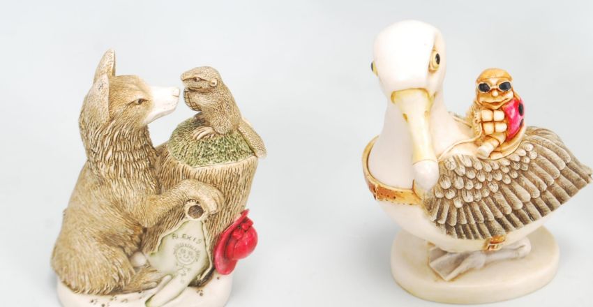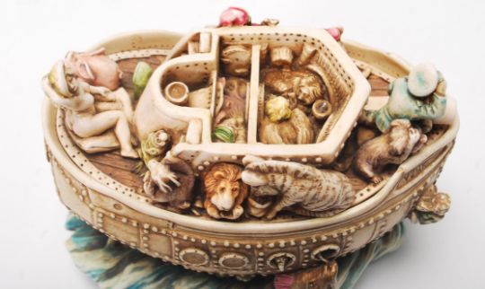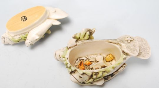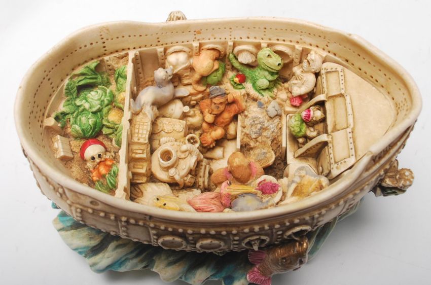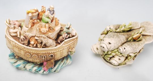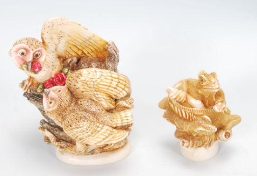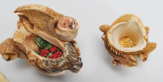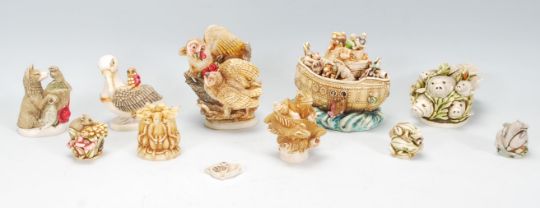 A selection of Harmony Kingdom ornamental boxes in the form of stylised animals to include a large noah's ark box,  manatees, roosting owls, frog, meerkats, iguana etc. Measures 14 cm high.