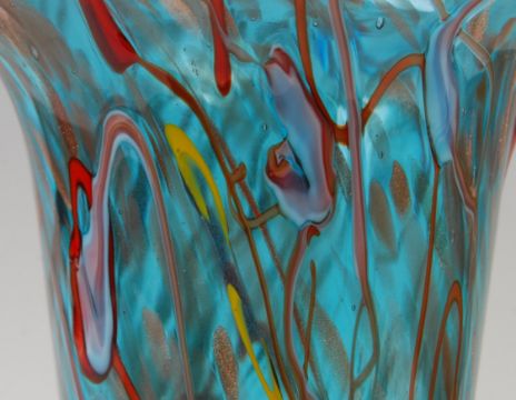 Viz Glass - A stunning large contemporary studio art glass vase having a wide ruffled rim with tapering and waisted body in an aqua blue colourway with streaks of red, blue, yellow, white and nickel gold glitter. Applied label to base. Measures; 31cm.