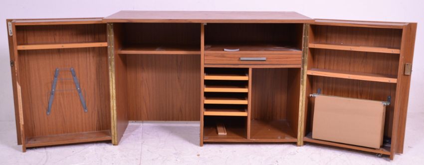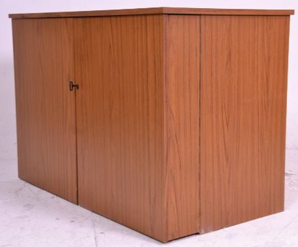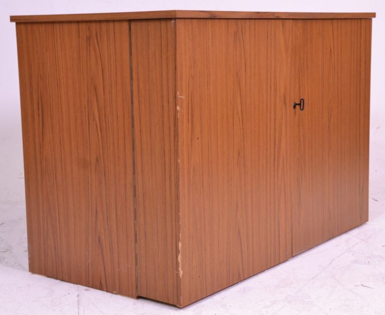A 20th Century vintage 1970's formica cube desk / filing cabinet having twin deep folding cupboard doors with shelving units to the interior, opening to reveal knee hole and and sectional interior within. Measures 76 cm high x 110 cm wide x 60 cm deep.