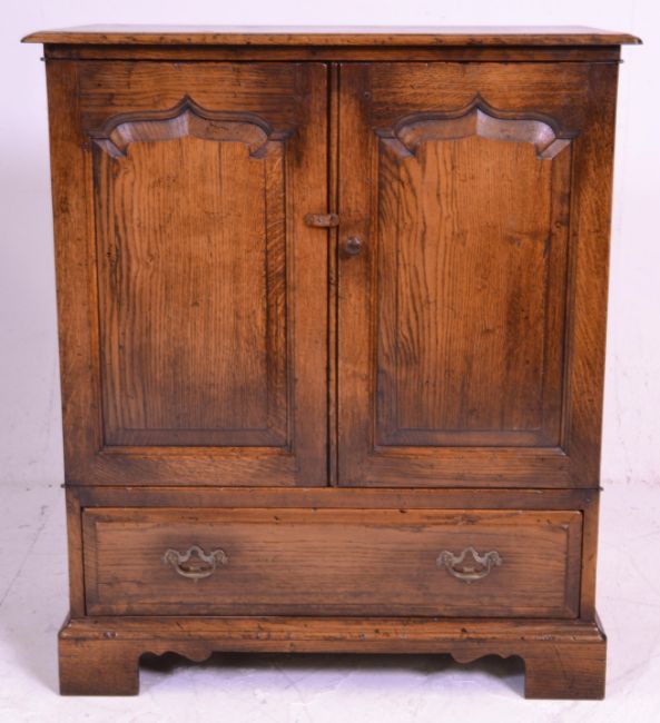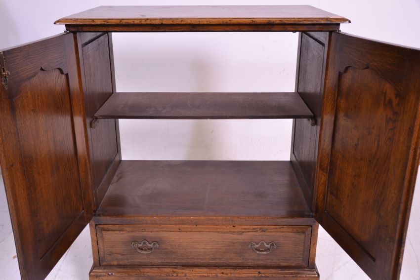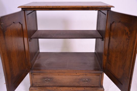 A good quality oak Tv / Cocktail cabinet in the manner of Rackstraw. Raised on block feet with short drawer under double door cabinet housing single shelf with open back. Measures 95 cm high x 80 cm wide x 49 cm deep.
