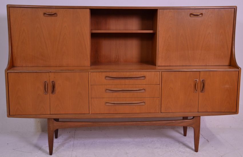 A retro 20th Century 1970's G-Plan teak highboard / sideboard credenza in the Fresco range. Raised on tapering legs with a series of cupboards and drawers having upright top with sliding door cupboard.