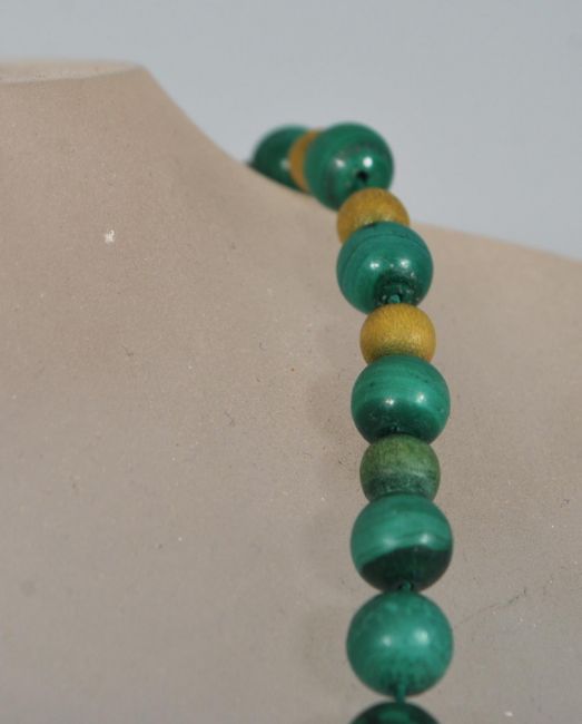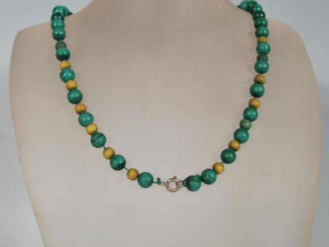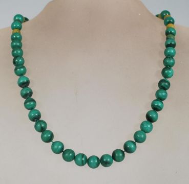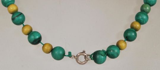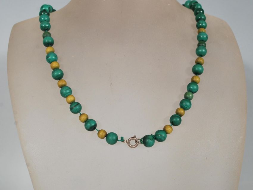 A 20th Century vintage malachite beaded necklace with round beads and a spring ring clasp.