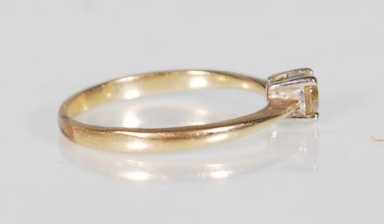 A 9ct yellow gold single solitaire diamond ring of approx 25pts set within a raised mount. Hallmarked rubbed. Gross weight 1.3g. Ring size L.