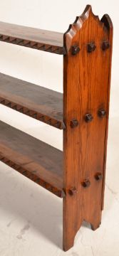 A Victorian 19th century pitch pine Gothic ecclesiastical Arts and Crafts free standing open bookcase having three shelves with carved geometric decoration to the edges, the shelves raised on shaped panelled supports.