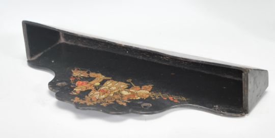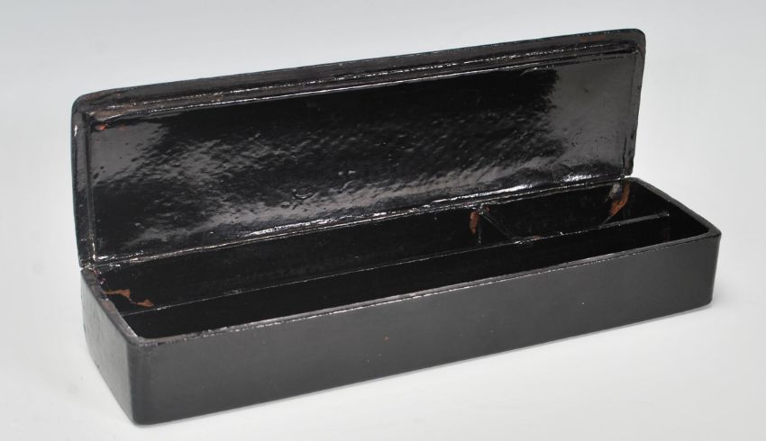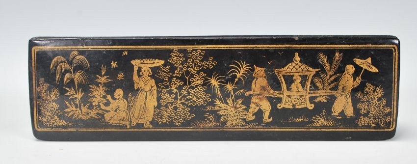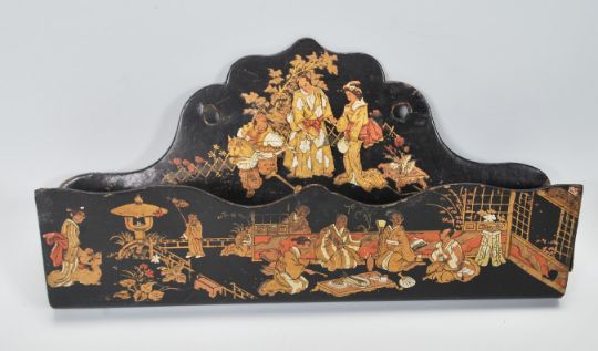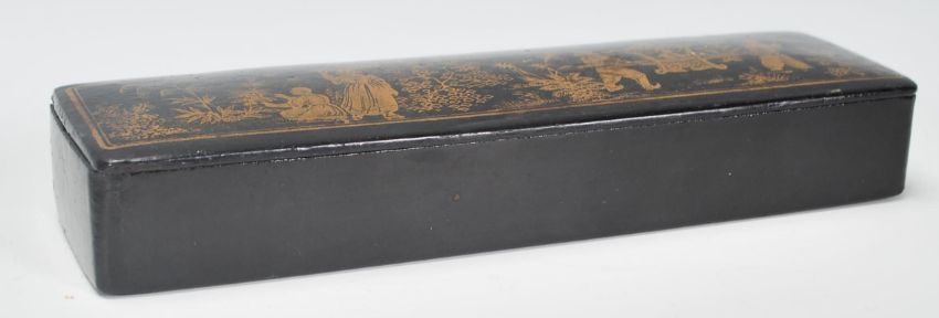 A vintage mid 20th Century Chinese lacquer wall mounting letter rack decorated with gilt Chinese domestic scenes, together with a desk top lacquer box having gilt decoration and sectional interior. Measures 12 cm x 23 cm.