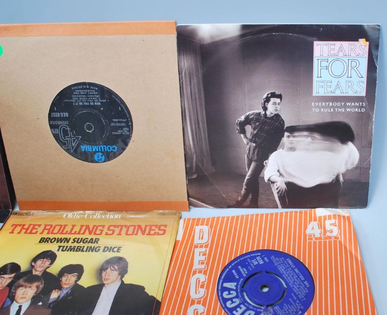 A large collection of approximately two hundred  7'' vinyl EP singles to include, multiple Beatles records, Elton John, The V.I.P. , Eddie Cochran, Frankie Goes To Hollywood, The Who, Roy Robison, Queen, Cliff Richard, Dire Straits Lady Writer, Bad Manners, Stevie Wonder, Billy Bragg...etc.