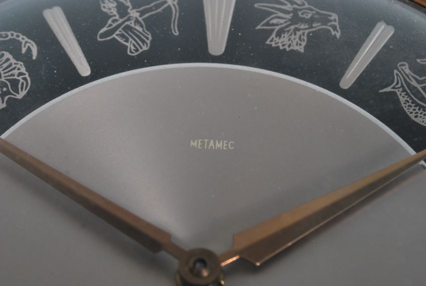 A vintage 20th Century electric bi colour wall clock by Metamec, the face decorated with the twelve signs of the Zodiac.