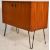 A stunning Danish retro vintage teak wood twin door cupboard having a shelved interior, each door with round handles with pull two centre of the handle. All raised on black hairpin legs. Measures 78 cm high  x  91 cm wide  x  43 cm deep.