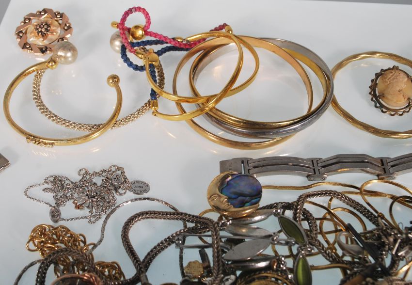 A selection of vintage and latter costume jewellery to include multiple gold and silver tone jewellery, necklaces, bangles, bracelets, pendants, filigree butterfly brooch and cameo brooch, tooth pendant, bar brooch etc.