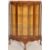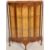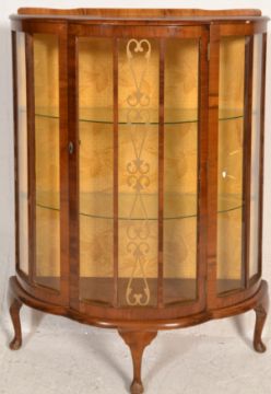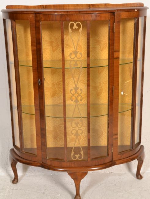 An early 20th Century 1930's Art Deco walnut demi lune display cabinet being raised on cabriole legs with pad feet having central glass door with two glass shelves set within. Finished with a stub gallery stage top above painted decoration glass front. Measures 115 cm high x 87 cm wide x 34 cm deep.
