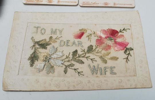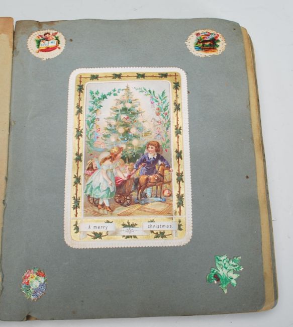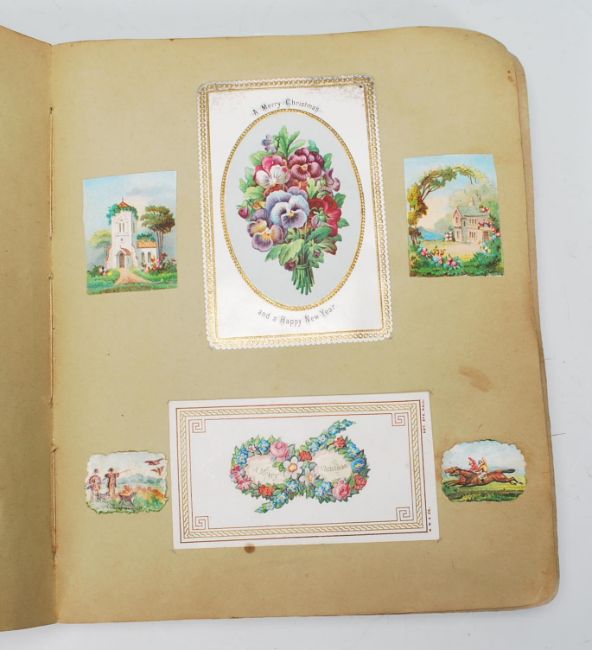 A good 19th Century Victorian decoupage scrap album with multiple coloured cards with to include Merry Christmas, Happy New Year, scenes of children playing and many other figure cut outs. Many having gilt decoration with multiple embossed examples. Together with a selection of sweetheart postcards. Scrap album measures 20 cm long by 16 cm wide.