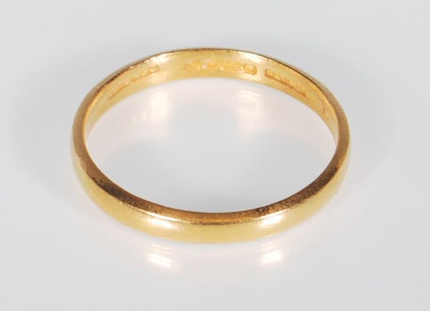 A hallmarked 22ct gold wedding band ring of simple form. Hallmarked Birmingham 1937. Weight 3.2g. Size S.