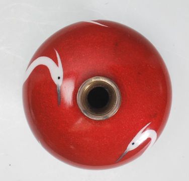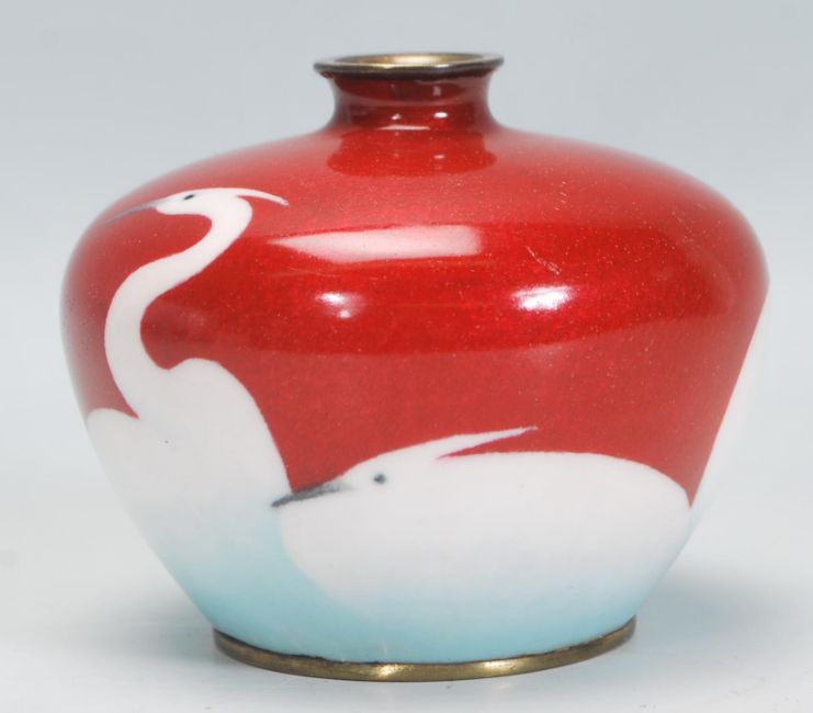 An early 20th Century Japanese cloisonne vase having red ground with multiple white cranes towards the base fading into a light blue. Impressed marks to base. Measures 8cm tall.